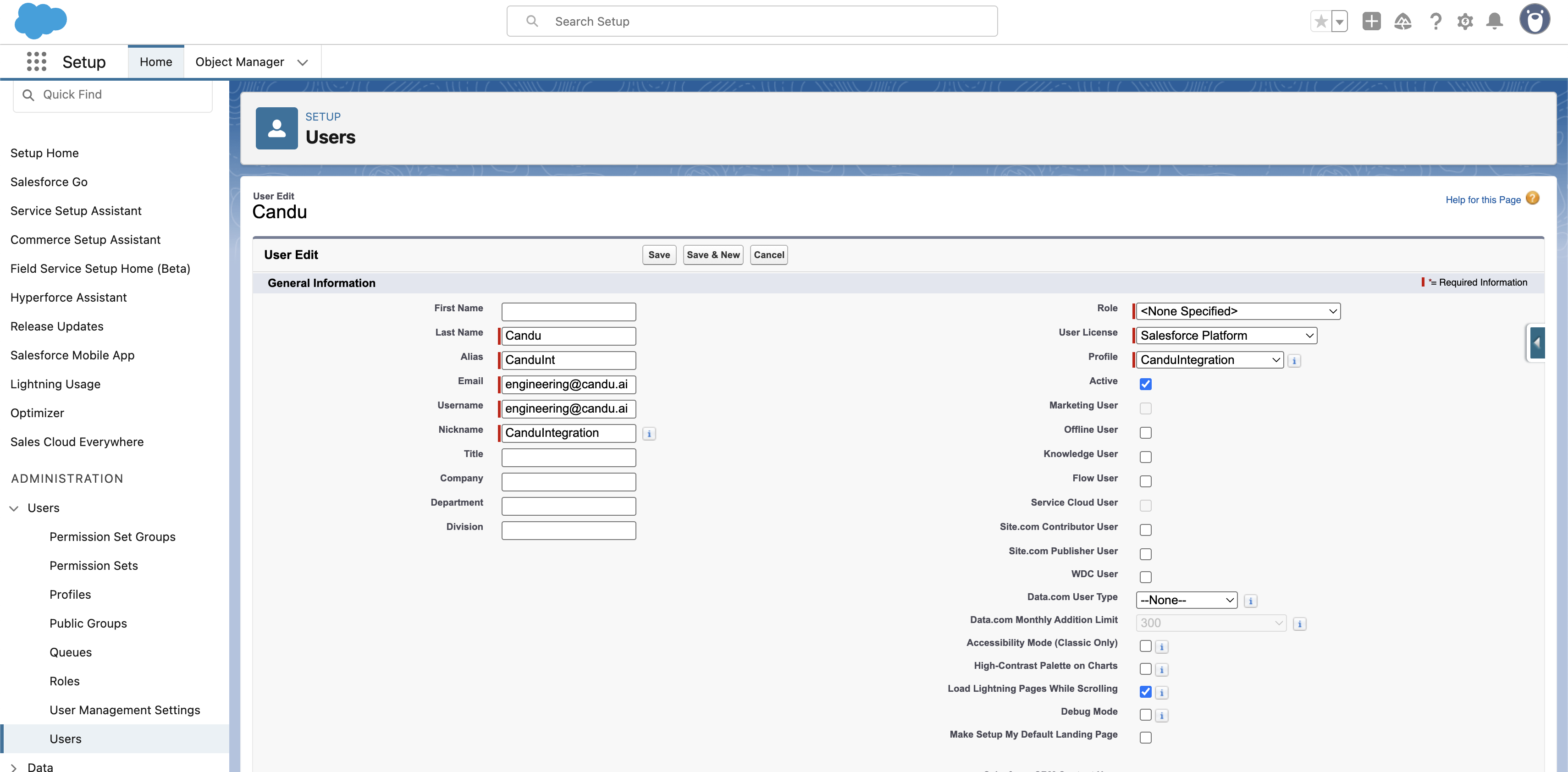 Create a Candu User, with email: engineering+{companyName}@candu.ai and associate the above Profile to this User.